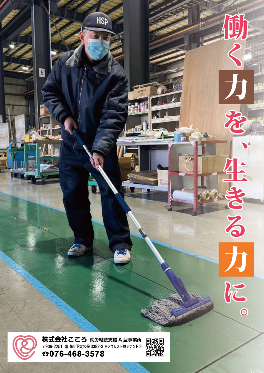 はじめまして、富山県の就労継続支援A型事業所の株式会社こころです。 「障がい者の方も安心して働ける社会」の実現のために、障害者総合支援法に基づいた就労継続支援A型事業所を2016 年12 月にオープンしました。
